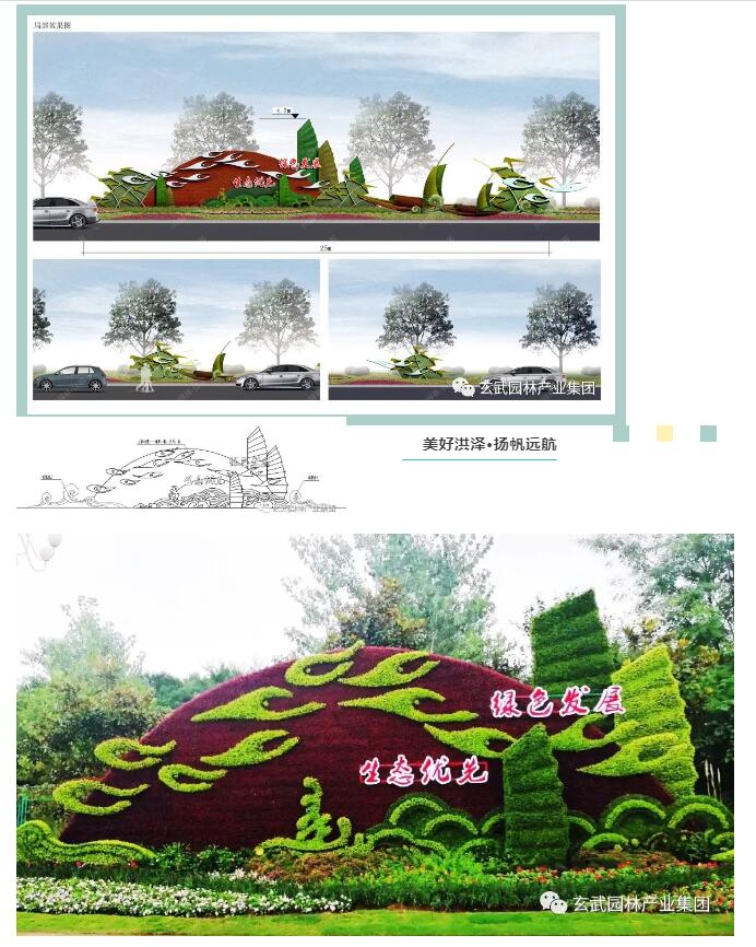 整體綠雕設(shè)計具有濃郁的水鄉(xiāng)文化特色,初升的旭日給洪澤帶來了晨曦,翱翔的鷺鳥展現(xiàn)著城市的魅力,在四方友人的美好希冀下,洪澤將更蓬勃發(fā)展、生機盎然。